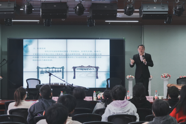 上海民族乐团的主讲人朱齐麒老师用生动诙谐的语言讲述了中国民族乐器源远流长的发展历史,让同学们对乐器产生的年代、形制、发声方式、演奏技法有了一定的认识与了解。接着,演奏家们轮番登场,赵臻老师先后吹奏了中国古代“八音”乐器中的匏类乐器——笙和芦笙。笙充满灵动的音色加上腔体和声的共鸣,让人仿佛置身于朝堂之上,转而又现于乡野之间;陆莎莎老师演绎的古筝名曲《高山流水》和伽倻琴曲,看似形似但风格完全不同的两种乐器,在她纤纤玉指之下,每根琴弦仿佛都成了一个个跳动的精灵;张佳伟老师演绎的维吾尔族乐器萨特尔,深邃悠长的弦音,把同学们带进了充满当地民族风情的新疆;王晓犇老师手持马头琴,演奏了一曲《牧歌》,把蒙古族人民的生活状态、风土人情刻画额淋漓尽致;中胡演奏的《二泉映月》,让同学们又再次领略了盲人胡琴演奏家华彦钧(阿炳)的心酸苦痛;最后,凌檬老师演奏的藏族传统乐器——弦子,让人不禁想闻声起舞,踏歌而行。