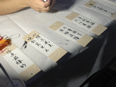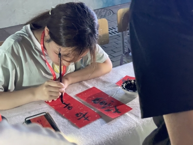 活动现场,我校大学生书画印社的同学以即兴书写对联、书签的方式展现书法、篆刻与拓印的艺术魅力,并与现场观众分享书法学习的心得及体会。互动体验环节中,大学生书画印社的同学带领同学们拿起毛笔在书签、宣卡纸上挥墨抒写,体验书法乐趣。体验过程中,同学们无论对于书法是否熟悉,经过尝试后无一不流露出欣喜的笑容,为体验到书法文化的魅力而感到兴奋。